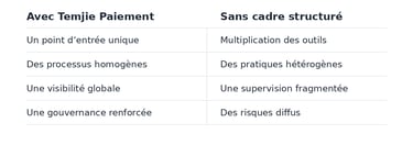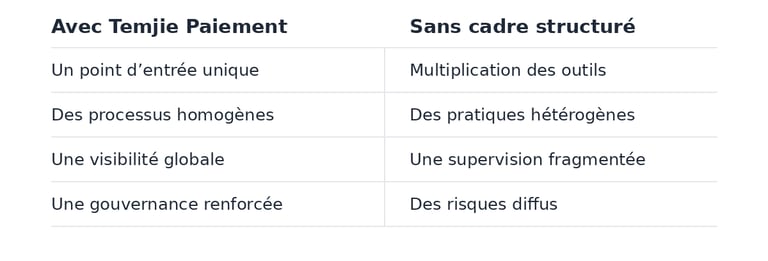 Temjie Paiement a été conçu pour répondre à cette complexité sans la déplacer ailleurs. La solution agit comme une couche de normalisation et de pilotage, indépendante des établissements bancaires.
